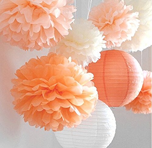 HOHODEAL 8 PCS MIXED PEACH IVORY ORANGE TISSUE PAPER POM POMS POMPOMS AND PAPER LANTERN WEDDING BIRTHDAY PARTY BABY GIRL ROOM DECORATION