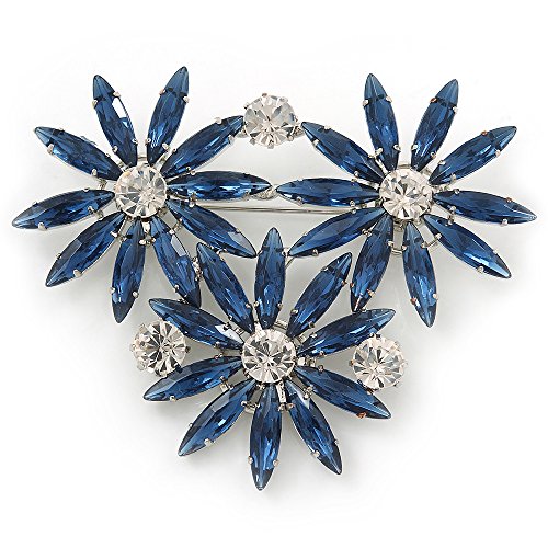 -. Title : Cobalt Blue, Clear Triple Flower Corsage Brooch In Silver Tone - 75mm Across
