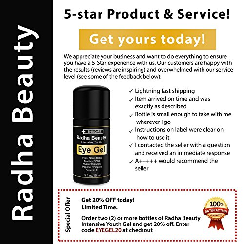 - Feature : ★ MOISTURIZES, & FIRMS SKIN ★ Radha Beauty's Intensive Youth Eye Gel contains a innovative combination of ingredients for superior results. Plant Stem Cells enhance its strength to protect against sun damage and other external aggressors while Hyaluronic Acid hydrates the skin and plumps it up with moisture and Matrixyl 3000 firms the skin / ★ REDUCES EYE BAGS, DARK CIRCLES & PUFFINESS ★ Our product provides protection to the entire eye area. For best results use this eye gel twice a day in order to restore your skin back to its natural youthfulness and reverse the signs of aging. Our Eye Gel will heal dark circles, eye bags, puffiness, crow's feet, fine lines, and sagginess so you can achieve a radiant, youthful and firm skin around the eyes and all over the face. / ★ SAFE FOR ALL SKIN Types ★ Non-comedogenic, does not contain parabens, sulfates or alcohol. / ★ THIS EYE GEL IS 98% NATURAL & 75% ORGANIC ★ Radha Beauty has created the most effective eye gel on the market - This Eye Gel is 98% natural which will give you healthy and younger looking skin! / ★ WORKS OR YOUR MONEY BACK ★ Our Guarantee: We back our products up with a 180-day hassle-free money back guarantee, no matter where you buy our product. There is absolutely no risk to you when you order now! If you are not completely satisfied, simply contact us and we will give you a full refund, no questions asked (you do not even have to return the bottle). Our #1 priority is to make sure our customers are completely happy.