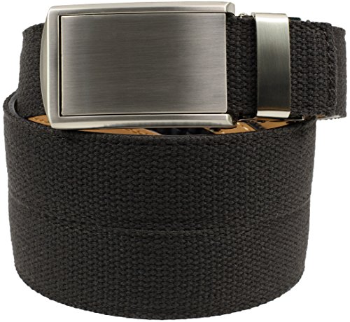 - Feature : Strap has a cotton/polyester blend upper with genuine leather backing. / Uses our no-holes belt mechanism to provide over 30 size positions at 1/4" intervals. / Excellent for a casual, relaxed look. / 1-1/4" (3.2cm) wide canvas strap. / Buckle measures 1-5/8" (4cm) wide x 3-1/2" (9cm) long.