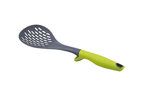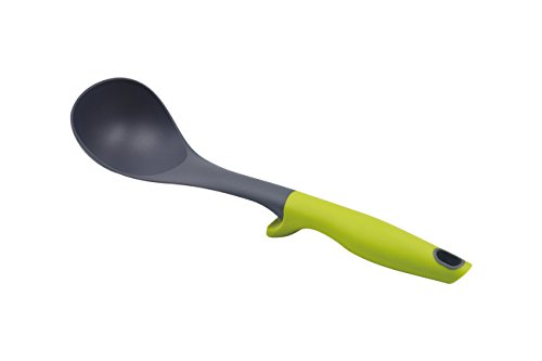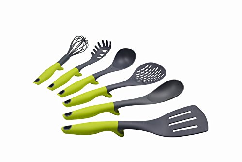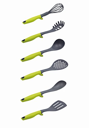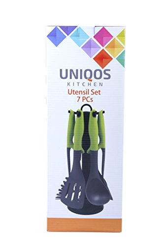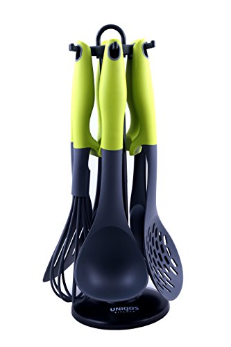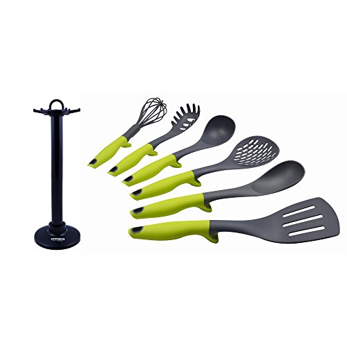 Ideal for any kitchen: These sleek and modern design kitchen utensil are a great addition to any kitchen. Strong and durable cooking tools help you enjoy cooking delicious dishes for your family. No more messy countertops. Soft, ergonomic grip for pain-free handling, hanging loop for practical storage as well as stand. Engineered for lasting performance and optimal cooking precision for everyday use. Cooking tools consist of soup ladle, slotted turner, slotted spoon, solid spoon, spaghetti server, skimmer and an 360° rotating organizer stand where hanging holes make it convenient to store individual pieces within easy reach Material: - Utensil: Nylon and handle of TPR