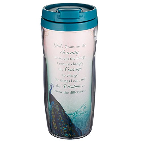 The Serenity Prayer Polymer Travel Mug, with a vibrant peacock artwork insert, has a pop-up open / close lid and holds 12 ounces of your favorite beverage for on-the-go enjoyment. The contoured shape of the body and the non-slip base make for comfortable and secure handling. Fits most car and truck beverage holders.