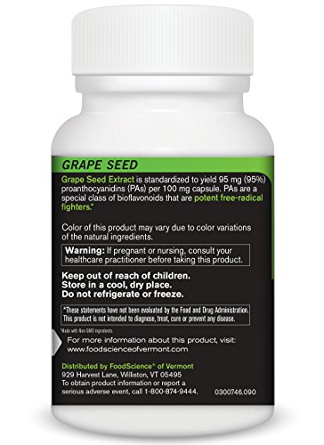 Studio : Food Science of Vermont Publisher : Food Science of Vermont Binding : Health and Beauty Product Description Grape Seed (Vitis vinifera) from FoodScience of Vermont, is standardized to yield 95% proanthocyanidins (PAs) per capsule. PAs are bioflavonoids, a group of water-soluble, low molecular weight plant substances with recognized free radical scavenging properties. They have the ability to inhibit the activity of certain enzymes which cause pro-inflammatory reactions within the body. PAs are unique because they are immediately bioavailable. 0