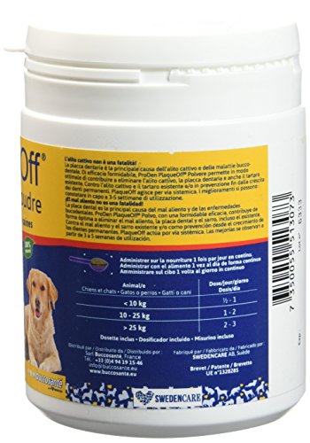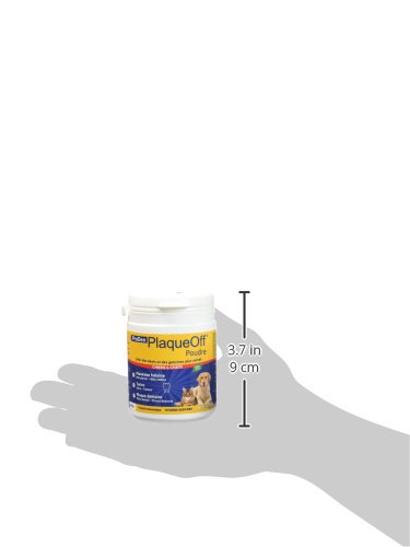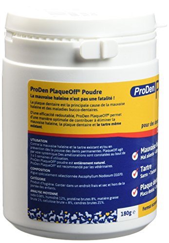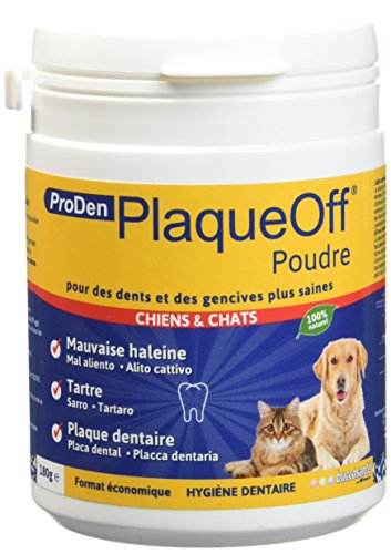 -. Binding : Misc. -. Brand : ProDen PlaqueOff -. EAN : 7350055513073 -. Feature : ProDen PlaqueOff® Powder is a pet dental product for dogs available from veterinary practices and selected pet shops. Used daily, this 100% natural product made from seaweed can significantly complement your pet's ordinary dental hygiene. -. Label : Swedencare AB (publ) -. Manufacturer : Swedencare AB (publ) -. Model : 27307 -. MPN : 27307 -. PackageQuantity : 1 -. PartNumber : 27307 -. ProductGroup : Pet Products -. ProductTypeName : PET_SUPPLIES -. Publisher : Swedencare AB (publ) -. Studio : Swedencare AB (publ) -. Title : ProDen PlaqueOff® Animal (180g)