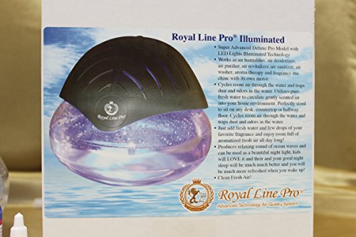 Brand New NEWEST Model! Royal Line Pro® Super Advanced Deluxe Pro Model with LED lights Illuminated technology. Works as air humidifier, air purifier, air deodorizer, air revatilizer, air sanitizer, air washer, aroma therapy and fragrance machine with its own motor. This is very similar to the Rainbow Rainmate and Thermax but more advanced! This unit has its own motor, very portable, no need to connect to the vacuum, just add water and your favorite fragrances and enjoy room full of aromitized fresh air! Cycles room air through the water and traps dust and odors in the water. Utilizes pure, fresh water to circulate gently scented air into your home environment. Perfectly sized to sit on any desk, counter top or hallway floor. Cycles room air through the water and traps dust and odors in the water. Just add water and few drops of your favorite fragrance and enjoy room full of aromatized fresh air all day long! If you or someone in your family has a cold, put a few drops of eucalyptus with menthol fragrance in the water (sold separately), and you will feel instant relief. It also produces relaxing sound of ocean waves and can be used as a beautiful night light. Kids will LOVE it! And their and your good night sleep will be much much better and you will be much more refreshed when you wake up! Clean Fresh Air!Feature
