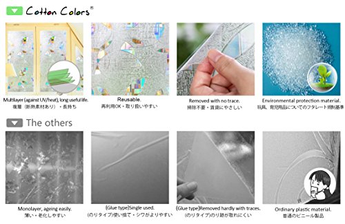 Characteristics Of CottonColors Window Film: 1.No-glue, Easy To Fix and Remove. Can Be Removed And Re-applied Easily Without Any Traces Left On A Glass Or A Smooth Surface; Can Be Reused Even After Several Years If Not Be Damaged Or Smudged. 2.More Than 96% UV Protected, Can Block Sunlight And Heat Getting Inside, Providing Coolness In Summer; But, Providing Warmness And Avoiding Glass Fogging In Winter. 3.Not A EVA Window Film, Avoiding Deformation In Installing And Using .