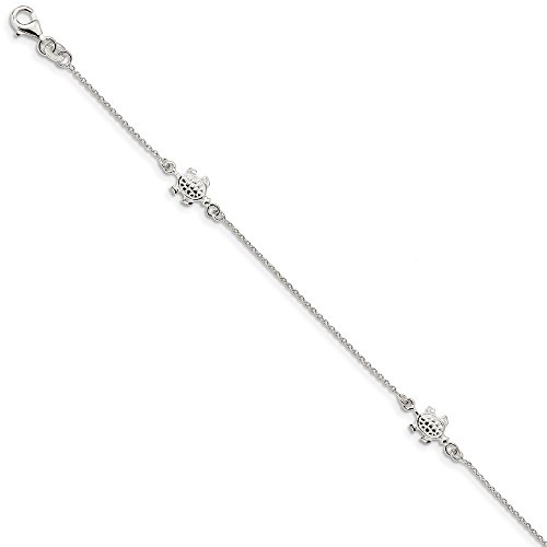 Anklets are a great way to add fun, flash and a feminine touch. This polished station design made from sterling silver features a 1mm solid link cable chain with 8 x 11mm turtle link stations. It is adjustable in length from 9 to 10 inches and closes with a fancy lobster clasp.Feature