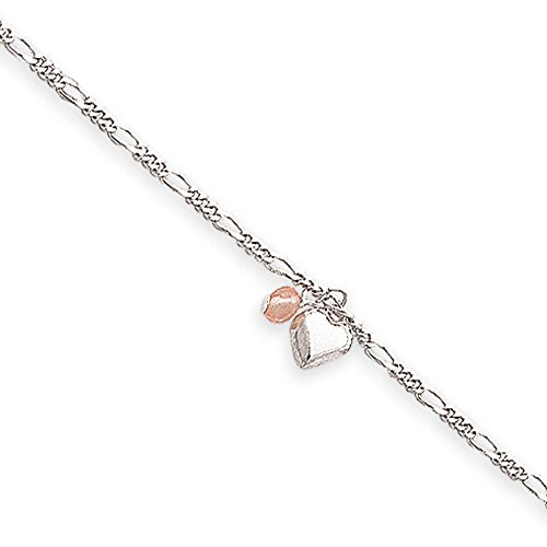 Accessorize your ankles with a fabulous bracelet that combines color and movement with each step you take. Dangling from this 2mm width, 9-inch long sterling silver Figaro chain is a shiny, 8mm puffed heart accented with a 4mm cherry quartz bead. A spring ring clasp keeps this stylish anklet securely fastened.Feature