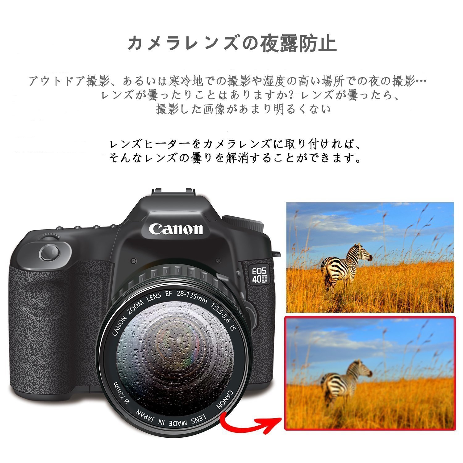1: The camera lens heater warms up the camera lens and prevents the occurrence of condensation.