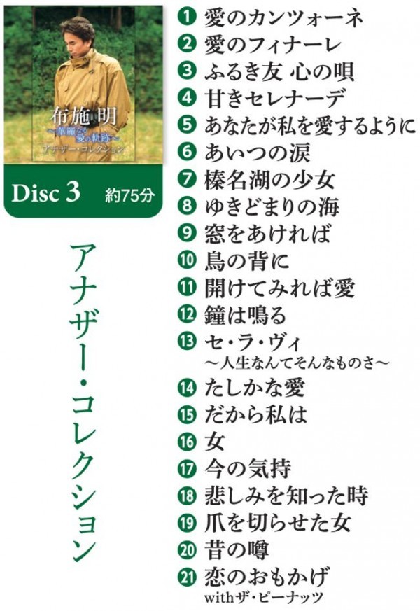 | 日本を代表するスーパーヴォーカリスト、布施明のデビュー50周年スペシャル・コレクションBOXです。デビューから円熟の時代にわたるベスト選曲をCD5枚組BOXでお届けします。シングル・ヒット曲を中心に、カヴァー曲、ライブ音源を含めた充実のラインナップです。 |