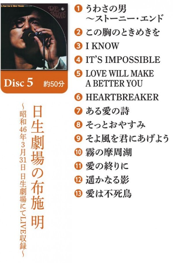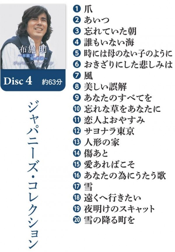 日本を代表するスーパーヴォーカリスト、布施明のデビュー50周年スペシャル・コレクションBOXです。デビューから円熟の時代にわたるベスト選曲をCD5枚組BOXでお届けします。シングル・ヒット曲を中心に、カヴァー曲、ライブ音源を含めた充実のラインナップです。 |