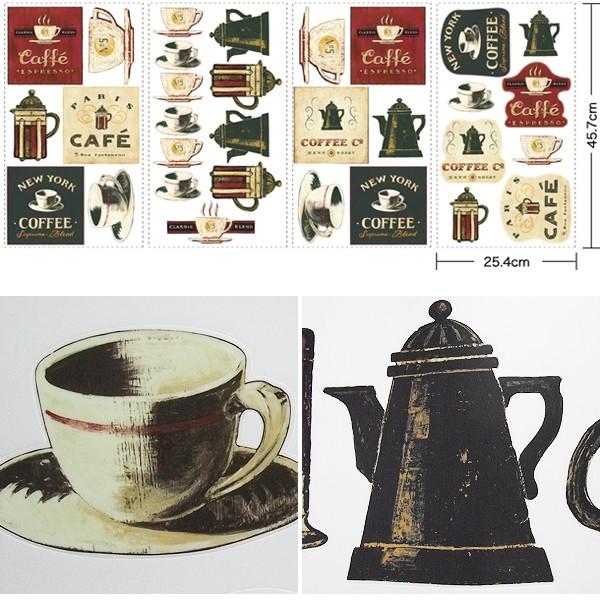 コーヒーカップやポットなどのセットで、キッチンがおしゃれなカフェに変身します。渋いアンティーク調のプリントは、カフェやレストランなどの店舗にもおススメです。 ★商品名★コーヒーハウス★商品番号★RMK1254SCS★シートサイズ★[ 45.7cm × 25.4cm ] × 4枚 ★内容★31ピース/1パック