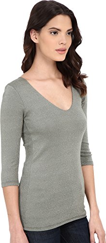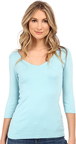V-neckline. Fitted top. Wide V-neckline. Three-quarter sleeves. Three-quarter sleeve style. Slim fit through bodice. Straight hemline. Unlined. Pullover design. 58% cotton, 42% nylon. 58% cotton, 42% nylon. Machine wash cold, tumble dry low. Made in the U.S.A. and Imported. Made in the U.S.A. and Imported.