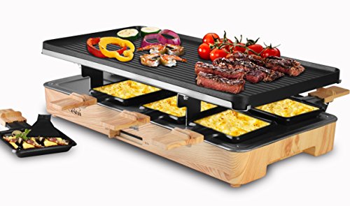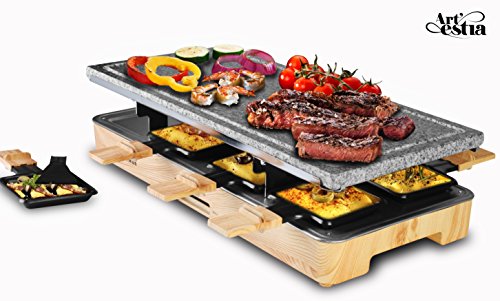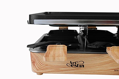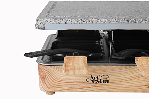 Electric Raclette Grill with Two Top Plates (Cast Aluminum Reversible Grill Plate and High Density Granite Grill Stone) by Artestia, Elegant Design Wood Pattern Base, Serve the whole family. Model number AR-89015