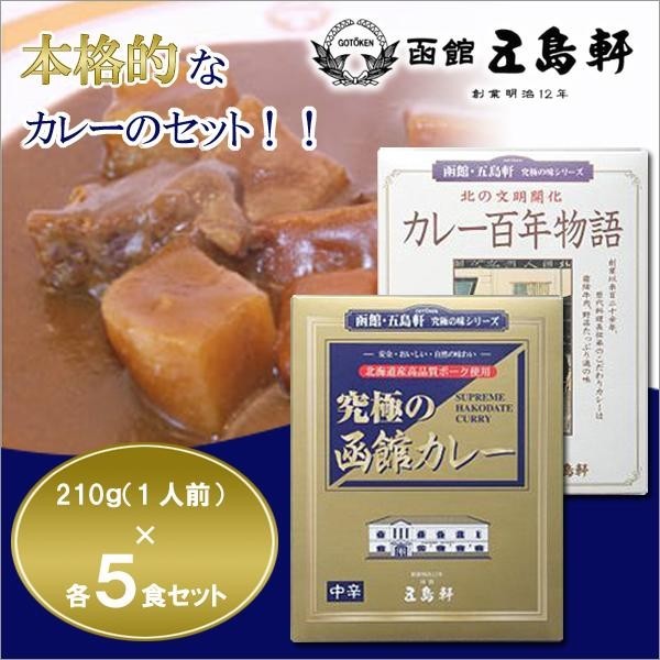 | セット内容 | 究極の函館カレー 中辛 レトルト 210g(1人前)× 5食 カレー百年物語 中辛 レトルト 210g(1人前)× 5食 |