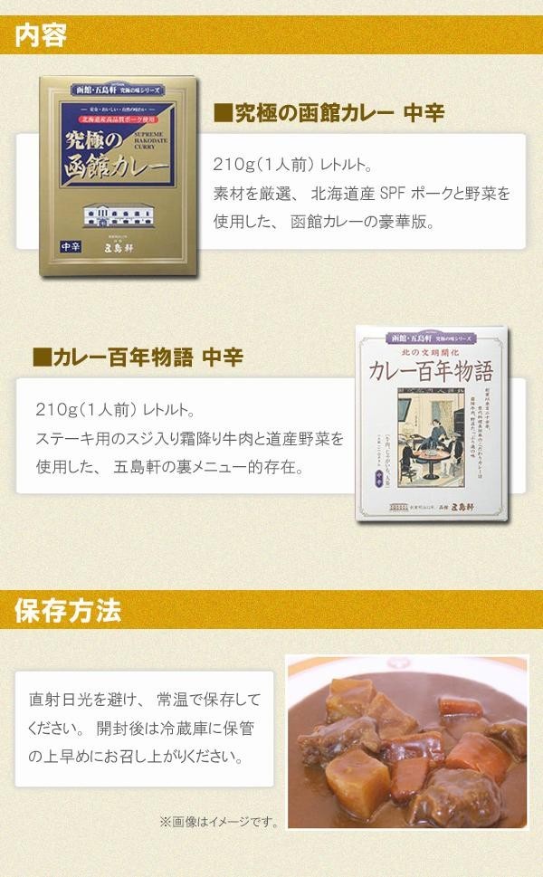 | 原材料 | 【究極の函館カレー】 野菜・果実(じゃがいも、人参、玉葱、りんご、にんにく、生姜)、豚肉、カレールー(小麦粉、食用油脂、食塩、カレー粉、砂糖、その他(大豆・バナナを含む)、カレー粉、マンゴチャツネ、バター、ビーフブイヨン、チキンブイヨン、ビーフパウダー/着色料(カラメル)、調味料(アミノ酸等)、酸味料 【カレー百年物語】 野菜・果実(じゃがいも、人参、玉葱、りんご、にんにく、バナナ、生姜)、牛肉、小麦粉、動物油脂、カレー粉、砂糖、食塩、バター、マンゴペースト、ビーフブイヨン、乳糖、チキンブイヨン、ソースパウダー、ビーフパウダー、香辛料、脱脂粉乳、ぶどう糖、着色料(カラメル)、調味料(アミノ酸等)、酸味料(原材料の一部に大豆、豚脂を含む) |