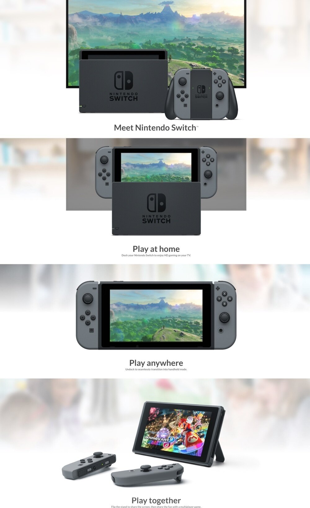 Introducing Nintendo Switch, the new home video game system from Nintendo. In addition to providing single and multiplayer thrills at home, the Nintendo Switch system can be taken on the go so players can enjoy a full home console experience anytime, anywhere. The mobility of a handheld is now added to the power of a home gaming system, with unprecedented new play styles brought to life by the two new Joy-Con controllers