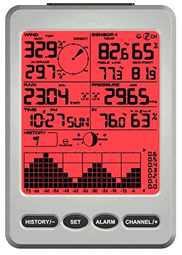The large, bold display features date and time, indoor and outdoor temperature and humidity, dew point, feels like temperature(which is a combination of wind Chill and heat index), wind speed, wind direction and rainfall