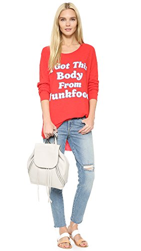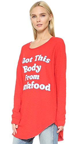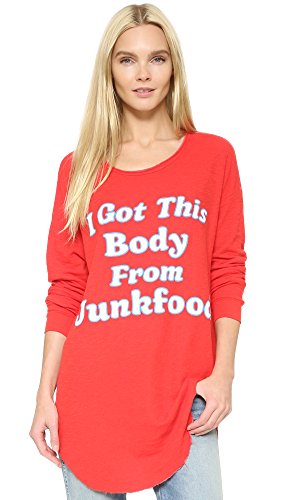 A tunic-length Wildfox top has retro charm with crackled 'I got this body from junkfood' lettering. Raw scoop neckline and curved hem. Long sleeves and banded cuffs.