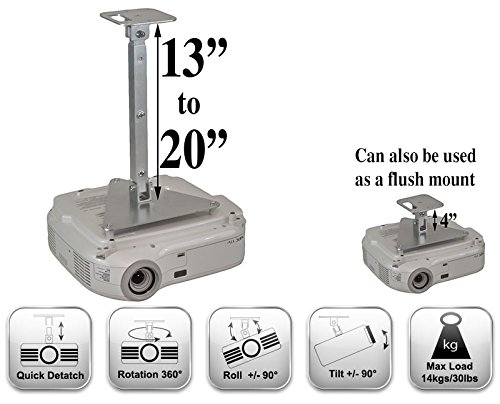 This mount can be used to lower your projector 4" below the ceiling or with the telescoping extension, 13" to 20" below the ceiling in 1" increments. WHILE I SHOULD BE FLATTERED THAT ANOTHER SELLER IS USING PICTURES OR OUR MOUNTS TO SELL THEIRS, IT IS REALLY NOT FAIR TO THE CONSUMER OR US. If it looks like our projector mounts but doesn't say "Projector-Gear" in the title, it is not a REAL Projector-Gear mount. We are proudly the highest rated and most sucessful projector mount seller on ebay: Kramerica_incorporated, and have a 100% rating with over 20,000 feedback! We have been at the top for years and had lots of people trying to copy our designs, but this is the first time we had another seller actually use our mounts in their pictures. I can't blame them though. Our mounts look MUCH NICER! KIT INCLUDES: 1. Projector Ceiling Mount 2. Telescoping Extension - projector can be mounted 4" or 13" to 20" below ceiling 2. Hardware to attach the mount to the projector and the projector to the ceiling 3. Easy to follow instructions (with lots of pictures). KEY FEATURES: Low Profile - 4" Below the Ceiling 100% Aluminum Design Projector-Gear mounts are the World's Best Selling Aluminum Projector Mounts NO ASSEMBLY REQUIRED - Fully Assembled Out of the Box Fully Adjustable Mount - Can Be Fine Tuned by Hand CNC Precision Machined 6061 T6 Aluminum (Aircraft Grade) Designed Specifically for Your Projector - Quickly Bolts Right On Buy with Confidence: Our mounts are designed and manufactured in the USA by Projector-Gear, LLC. Projector-Gear mounts have been sold worldwide on ebay for years and have a 100% rating on over 20,000 feedback.