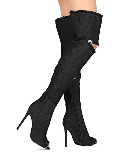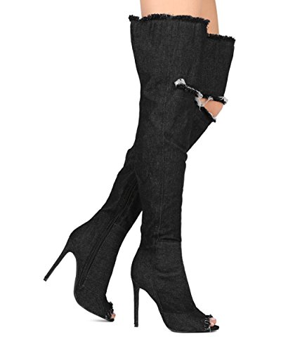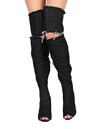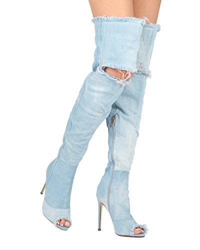 Alrisco Women Frayed Denim Thigh High Peep Toe Stiletto Boot - HG12 by Liliana Collection