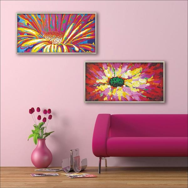 カラフルにハンドペイントされたキャンバスをリッチなフレームにセットしたモダンアートです。