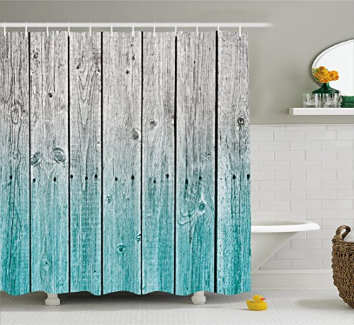 Rustic Shower Curtain by Ambesonne, Wood Panels Background with Digital Tones Effect Country House Image, Fabric Bathroom Decor Set with Hooks, 70 Inches, Teal Grey