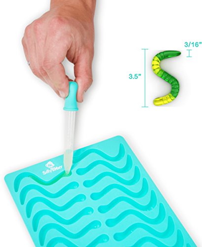 - Contents & Dimensions; Gummie Worm Mold Package includes x2 cute colored silicone candy molds with x20 cavities each, also included x2 droppers for kids. Dimensions: 10"(L) x 7" (W) for each gummy worm mold