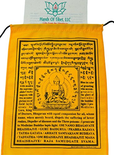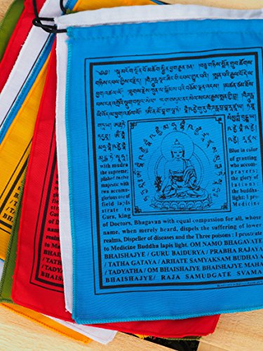 We combined our knowledge of Tibetan prayer flags with the amazing quality of flags made in Bali, Indonesia to make these unique prayer flags. These cotton flags are surged, which enhances their beauty and durability. Prayer flags are traditionally hung outdoors (on trees, homes or mountain tops) so that when the wind blows their energy and prayers are released into the universe. These flags would also look beautiful as an indoor decoration to set the intention in the space. Medicine Buddha is a powerful Bodhisattva in Tibetan Buddhism believed to promote healing, both inner and outer. These flags have Medicine Buddha's mantra printed in Tibetan and English as we as portraying the image at the center of each flag. Each flag Measures 6 inche by 8 inches.Feature