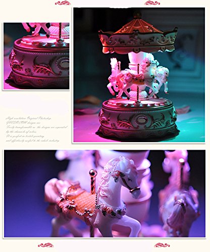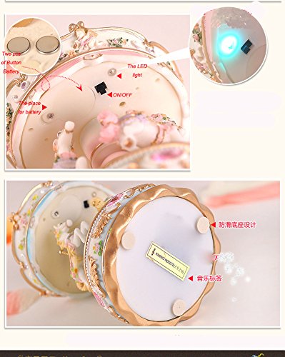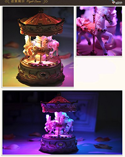 Feature : Synthetic resin music box with LED light play the Castle In the Sky Tune / High quality polyresin music box / 3 horses can rotate with music. Beautiful carving around the body of the music box / Use the bottom key to turn the Spring tightly, then release and will be playing / An exquisite, music box for your friends, spouse, sweetheart, relatives, or yourself as a gift