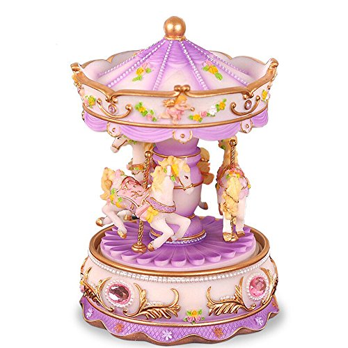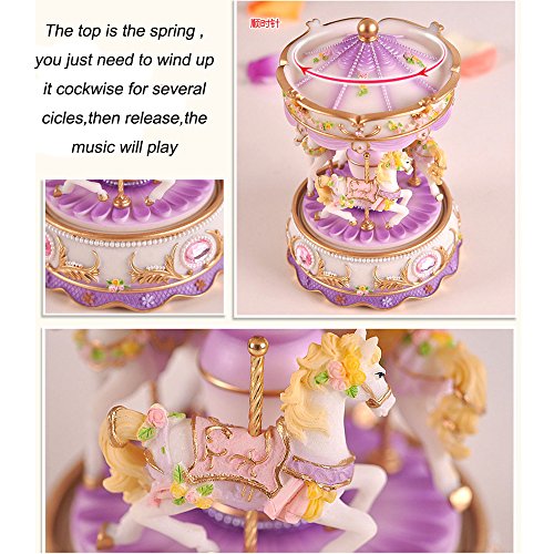 Title : Laxury 3-horses Carousel Music Box with LED Lights Brand New Polyresin Material, Play the Castle in the Sky (Purple)