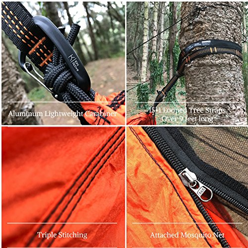 Hammock with Mosquito Net by Kini Active - 9.8 x 6.5 ft Double Sized and Lightweight Parachute Hammock with 9 ft long Looped Tree Straps & Aluminum Wiregate Carabiners Included