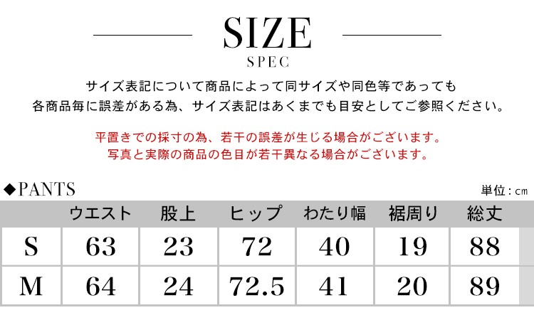 | サイズ | ウエスト:[S]63cm [M]64cm 股上:[S]23cm [M]24cm ヒップ:[S]72cm [M]72.5cm わたり幅:[S]40cm [M]41cm 裾周り:[S]19cm [M]20cm 総丈:[S]88cm [M]89cm |