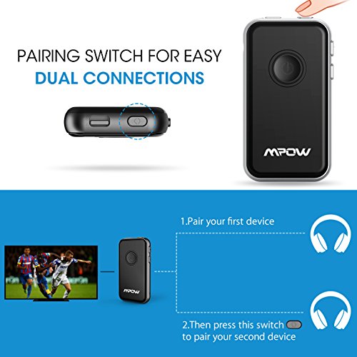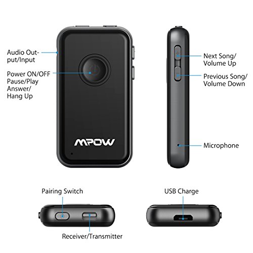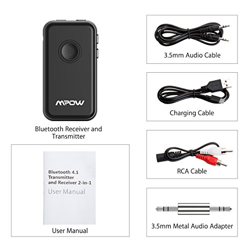 Studio : Mpow Publisher : Mpow Binding : Electronics Product Description RX Mode (Receiver Mode) 1. Connect the device to your non Bluetooth headphone/home speakers or car stereo system with 3.5mm audio cable. 2. Pair the receiver to your smart device. 3. Now you can enjoy your music through your headphone, speakers, home stereo system/car stereo system, or answer hands free calls. TX Mode (Transmitter Mode) 1. Pair the device to your Bluetooth headphones or Bluetooth Speakers. 2. Plug it in your non-Bluetooth media devices (such as MP3, CD/DVD player, TVs, etc.) via 3.5mm audio cable or RCA cable. 3. Now you can enjoy your music via Bluetooth speakers/Bluetooth headsets from your non-Bluetooth media device! Specification Bluetooth Version: 4.1 Frequency Range: 2.4GHz Output Power Category: Class 2 Bluetooth Mode: HFP/HSP/A2DP/AVRCP Bluetooth Range: Up to 33 feet Battery: 180mAh Working Current: 15mA (MAX) Charge Voltage: DC 5.0V Packing List - 1 * Bluetooth Receiver and Transmitter - 1 * Charging Cable - 1 * 3.5mm Audio Cable - 1 * 3.5mm Audio Adapter - 1 * RCA Cable - 1 * User Manual Warranty Every MPOW Product includes a 45 days money-back 18-month worry-free. 0