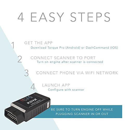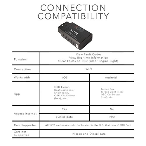 -. Feature : KOYA WIFI OBDII Scanner works on all vehicles located in the USA since 1996 and later. For your vehicle to be OBD II compliant it must have a 16-pin DLC (Data Link Connector) under the dash and the Vehicle Emission Control Information Label must state that the vehicle is OBD II compliant. / Easy to use! Connects to your iPhone / iPad / Android Phone / Tablet / Windows PC via a 3rd party app. App cost ranges from $0-$9.99 depending on your needs. / Read & display diagnostic trouble codes for the check engine light, both generic & manufacturer specific codes and display their meaning (over 3000 generic code definitions in the database) - including Engine RPM, Load Value, Coolant Temperature, Fuel System Status, Vehicle Speed, Fuel Trim, Intake Manifold Pressure, Timing Advance, Intake Air Temperature, Air Flow Rate, Absolute Throttle Position, Oxygen sensor voltages etc. / Support iOS 5.1.1 or later & Android & Windows, Support (free "OBD Car Doctor" APP, the "DashCommand" APP is $9.99) for iOS Devices, Support TORQUE software for Android Devices, OBDscope software for Symbian Devices / Manufacturer 18 Months Warranty - please contact us if you have any problem with our OBDII Scanner.