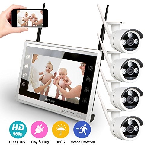 -. Feature : 4ch wireless nvr with built-in 11inch LCD monitor, You can Use the System without Any Cables. You have to Connect them to the Power Adaptors for Supply Power to Camera and NVR. No Need Video Cables / 【960P HD Video Day & Night, Indoors & Outdoors 】Wifi camera1.3 Megapixel (1280*960@30/25fps), IP66 Weatherproof outdoor features and 3.6mm lens provides more clear & crystal Image and capture more details in a larger area & view angle is 75 degree and night vision range up to 65ft(20m) with color image in the daytime and black and white color in the night. / 【Long & Stable Wi-Fi Range】 -- NVR with built-in router, Wi-Fi transmission distance up to 1000ft in open space without obstacle.Automaticlly connect WI-Fi Network camera, package included 1. 1 x 4ch Wifi 11"LCD monitor NVR(802.11b/g/n) 2. 4 x wireless IP Camera 3. 4 x 12V 1A Power Adapter 4. 1 x USB Mouse 5. CD,user manual,screws. / Support Smart phone APP(Android, IOS, IPAD), Receive email alerts upon motion detection or app alert when set it up (Notice here please set it up properly to avoid email blast) & System aupports synch-playback, video backup and video detection & supports 1 sata port & max video storage 4TB ( without HDD in our package ) & 1 USB 2.0 port for operation of mouse control. / VGA/HDMI,USB output, kindly notice: this system is without HDD in this box