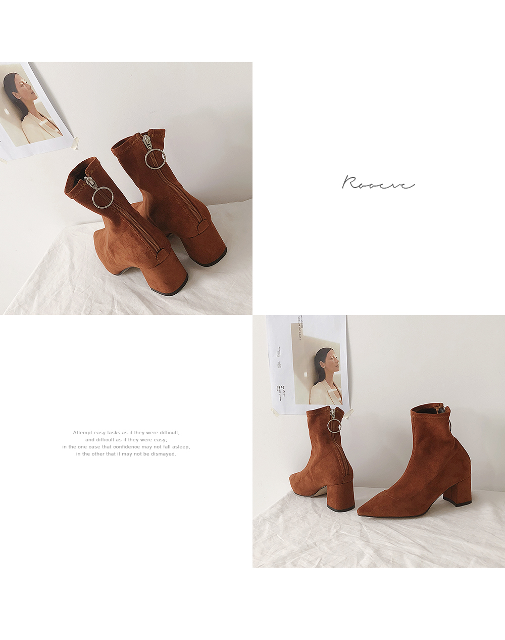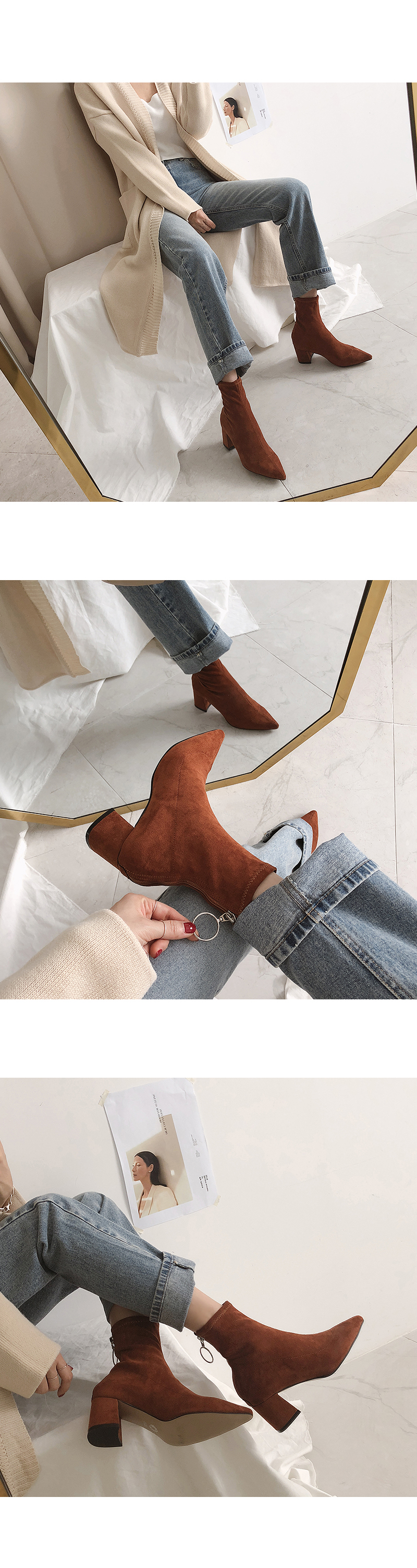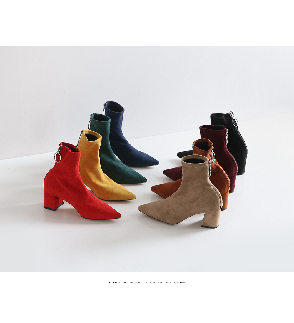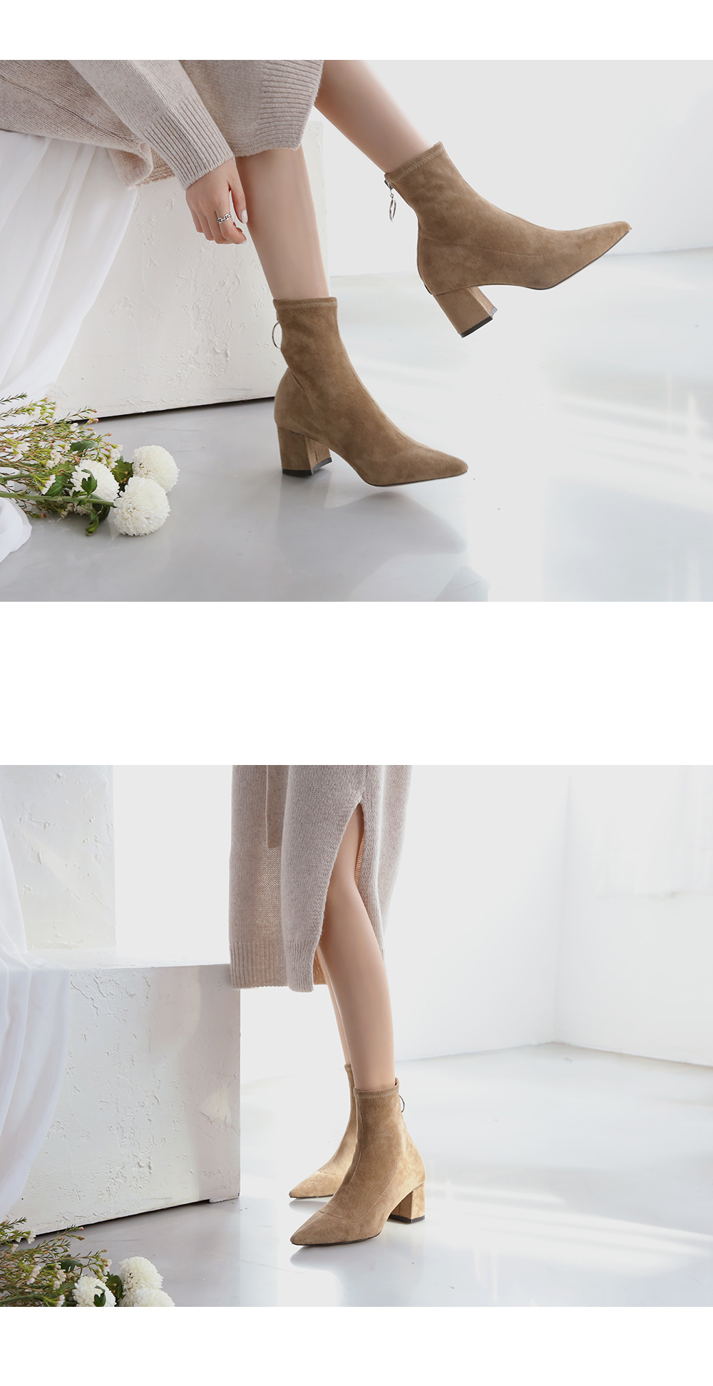 볼드한 굽과 텐션감있는 스웨이드 소재로 양말을 신은듯