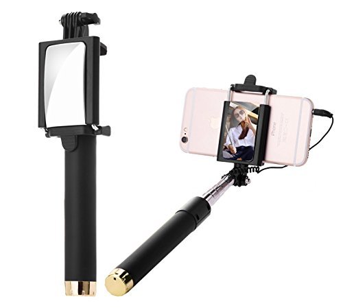-. Feature : Rearview Mirror allows you to take highest quality selfie with the powerful rear camera on your phone / Mini size, lightweight and flexible, easy to carry. Mini compact, not occupy space. / Fully compatible with Android/IOS system, comes with teh camara button at the handle, a key to open the bluetooth, a key pictures, without cumbersome set, easy to use. / Wired selfie-stick, no Charging needed! Save the Charging time and take more sefile. / Mobile phone facing clip at the soft pad design. To avoid scratching the mobile phone, mobile phone tie does not shift, not rock, no need to worry about mobile phone is overweight, comprehensive protect your smartphone.