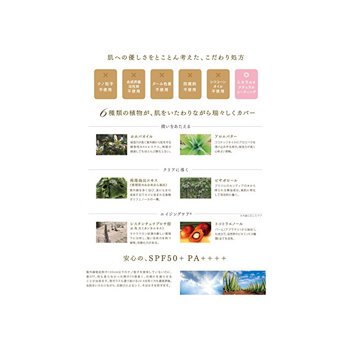 전성분:''《호호바》종자유,산화 티타늄(티탄),캔디 리라 로,실리카,산화 아연,《미츠로우》,야자유,알로에《베라》잎 엑기스,《시스탄치츠부로사》근 엑기스,갈해초 엑기스,《비사보로루》,토코 새《에노루》,앨 대게 아스《피노사》핵유,토코 fellow《루》,다이의유,스테아린산,스테아린산Mg,my car,산화철 ''