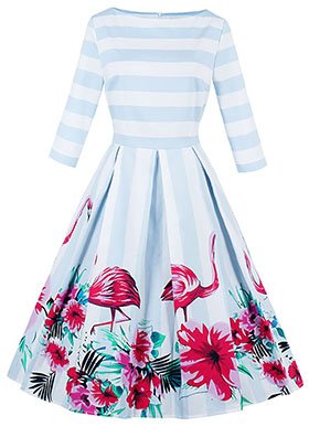 KILLREAL Women's Vintage Rockabilly Flamingo Floral Print Striped Pleated Dress with Half Sleeves Blue X-Large