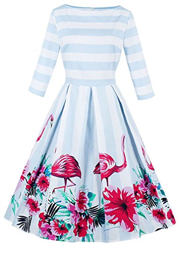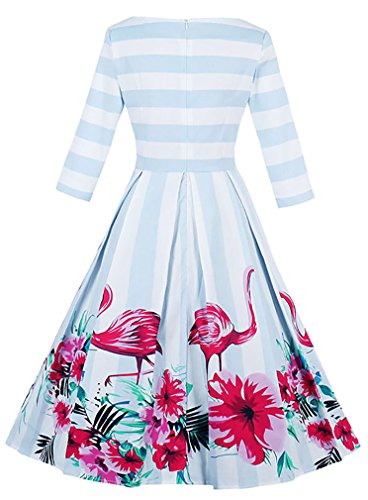 KILLREAL Women's Vintage Rockabilly Flamingo Floral Print Striped Pleated Dress with Half Sleeves Blue Large