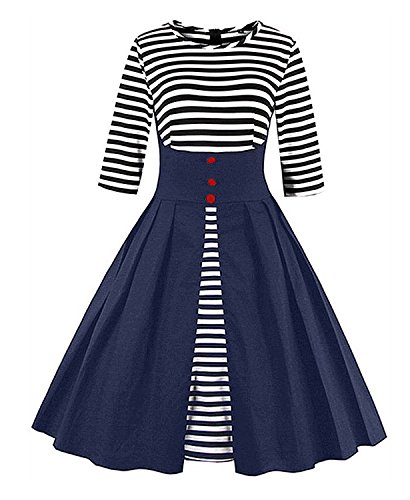 KILLREAL Women's 1950's Vintage Striped Business Casual Dress with Half Sleeves Blue X-Large
