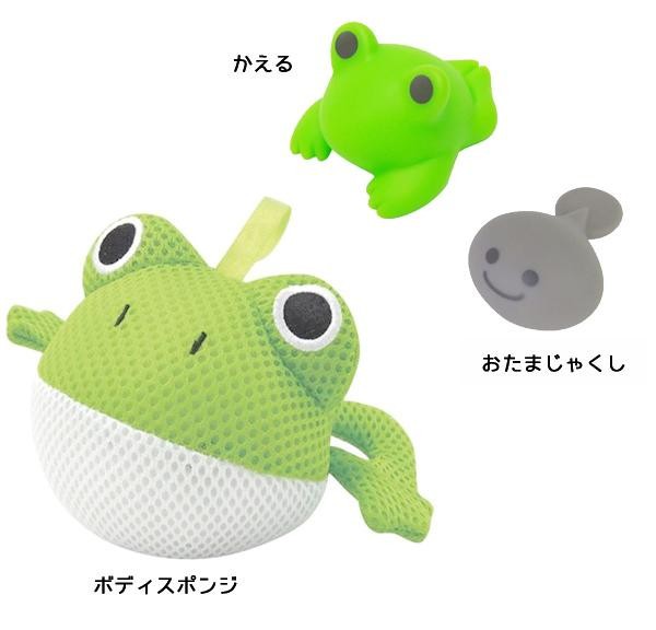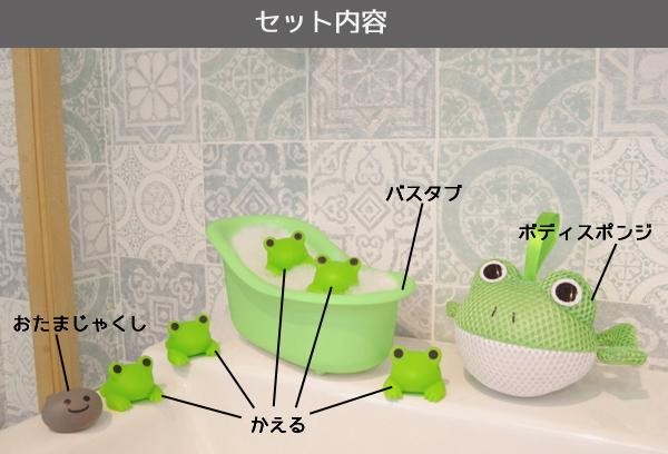 | セット内容 | フィギュア×6(かえる×5、おたまじゃくし×1)、ボディスポンジ、バスタブケース |
