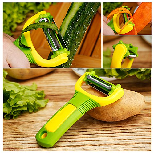 MULTI-PURPOSE PEELER - 3 blades, 360 Degree Swivel. Knife face peeler for hard skinned fruits and vegetables. Serrated skin peeler for peeling waxy or slippery fruits. Julienne blade for making julienne strips of carrots, potatoes and so on.