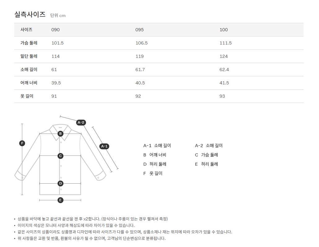 ■ 사이즈- 90(55), 95(66), 100(77)■ 소재- 겉감: 폴리에스터 100%. 안감1: 폴리에스터 100%. 안감2: 폴리에스터 100%. 충전재: 폴리에스터 100%.