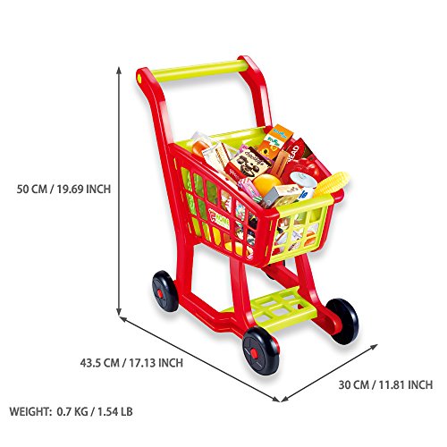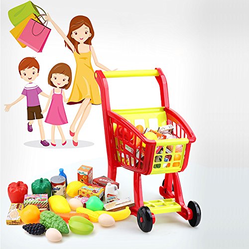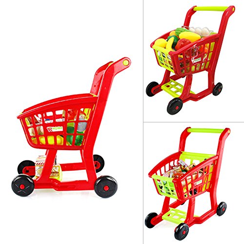 The Seprovider Shopping Cart Toy promotes fun imaginative play. This colorful toy shopping cart features easy-to-move plastic wheels and a basket. It also comes with 16 pieces of plastic play food and 9 paper box play food. This kids' play shopping cart is a fun way for children to mimic the action of grocery shopping at home. Features - Safe and sturdy for children to play with.