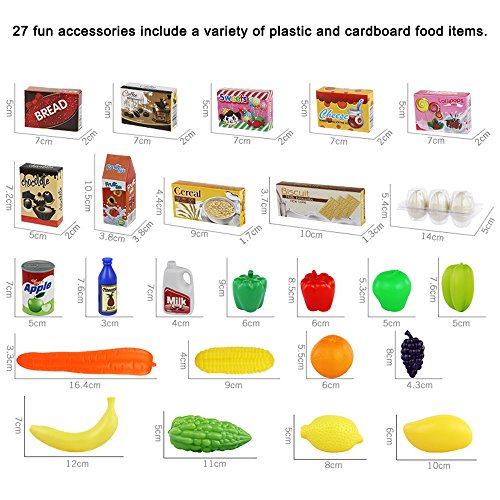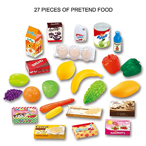 (●) Package includes: 1 x Shopping Cart with 27 pieces of grocery food playset