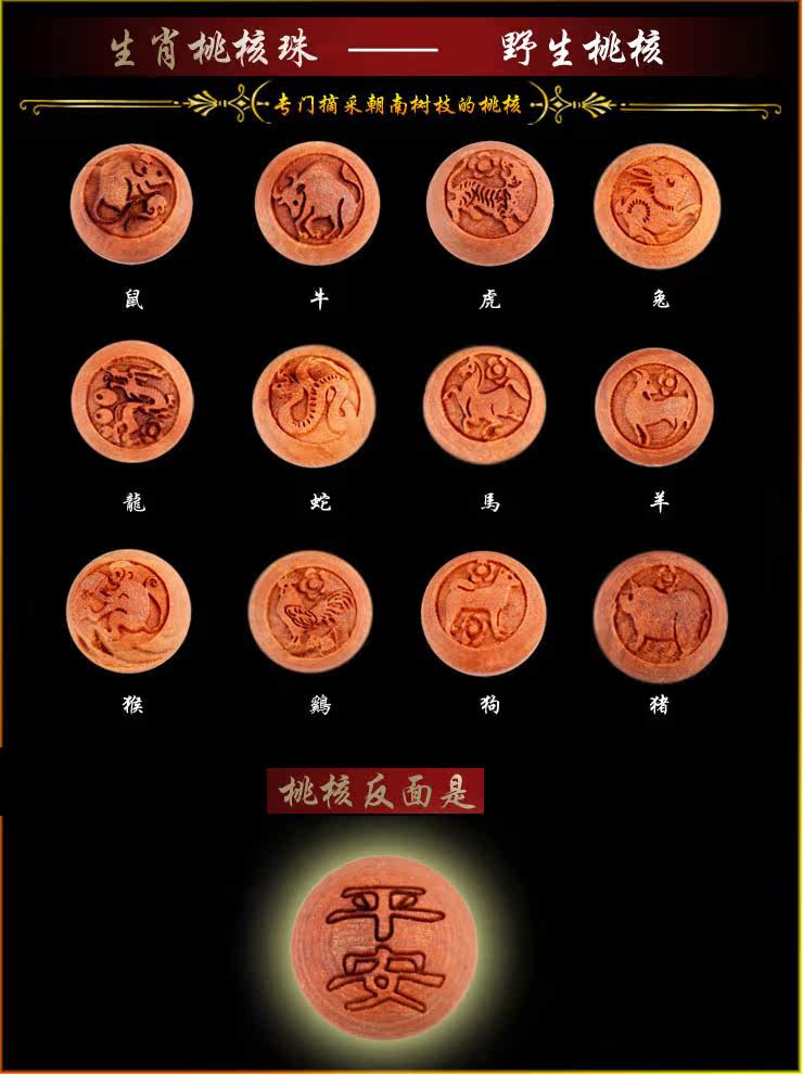 狗牙长约2.5厘米,生肖桃核直径约0.8厘米,(生肖蛇桃核直径约1.2厘米),猪惊骨宽约1厘米