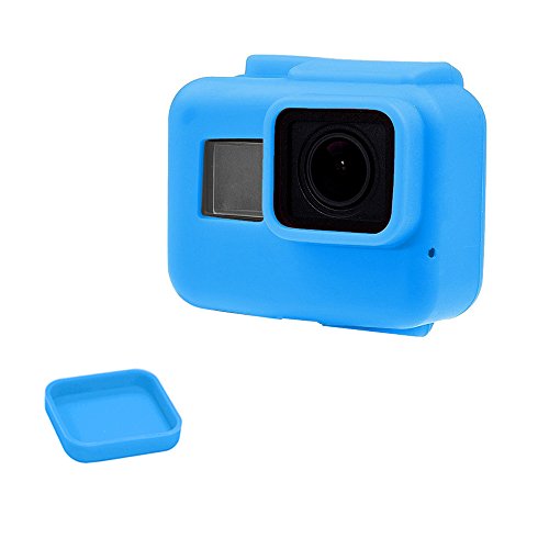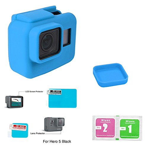Gopro Hero 5 Protective Silicone Case + Lens Cover + LCD Protector + Cleaning Wipes 4 Items (Gopro Case Blue)