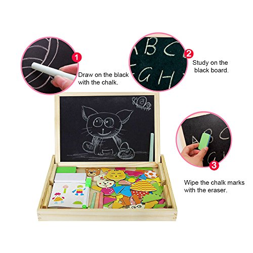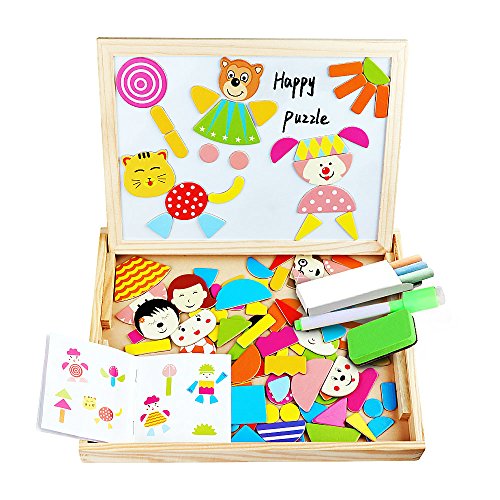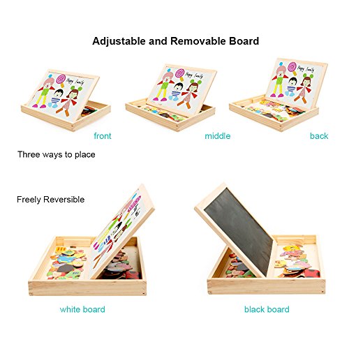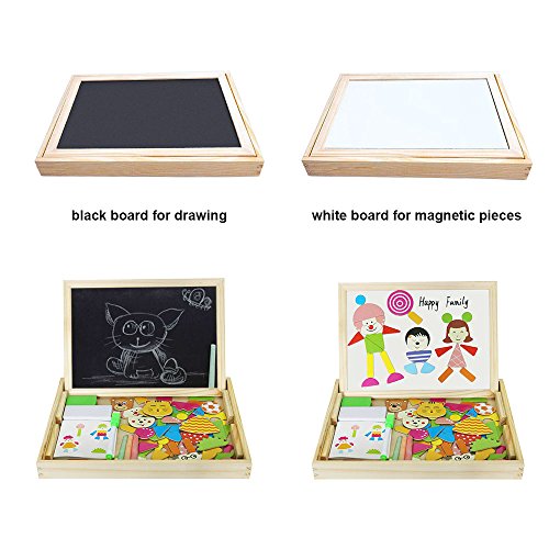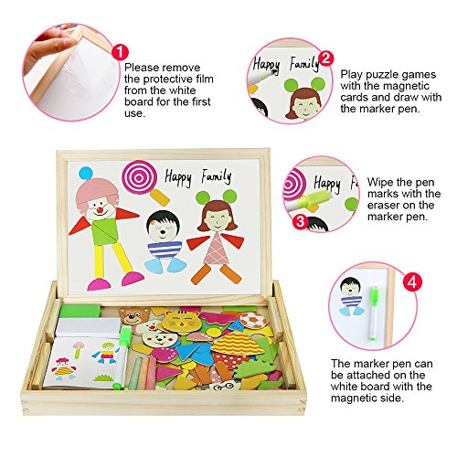Let your child engage their imagination, have fun, learn and discover concepts and train their motor skills. ---Diwenhouse Wooden Magnetic Jigsaw Puzzle 100 Pieces Help Your Kid's Development This educational toy will encourage your child's recognition for patterns, hand-eye coordination and spatial intelligence, as they try to form animals, plants, figures and pictures either inspired by the examples or by what they have in mind. This magnetic puzzle set will also help the kids improve their aesthetic judgment, learning about the match of all shapes and colors and distinguish which element is more appropriate and beautiful. Multifunctional Wooden Magnetic Board Set 1. On the black chalkboard, children can write or draw with the supplied chalk. You can wipe the chalk marks with an eraser inside the box. 2. On the white magnetic side, children can play puzzle game with magnet and draw with the marker pen. A Great Activity While Traveling Portable and easy to store, it is an great traveling game for your little ones, keeping them busy and quiet for a while, having fun passing time while in the car. Note: Remember to remove the protective film from the white board before using it for the first time. What You Will Get: 1×wooden box 1×reversible double sided board 100×magnetic paper pieces 3×chalks 1×marker pen 1×idea book 1×blackboard eraser Friendly Customer Service We are always here to provide prompt and satisfying customer service if you have any idea about the product. 0 |